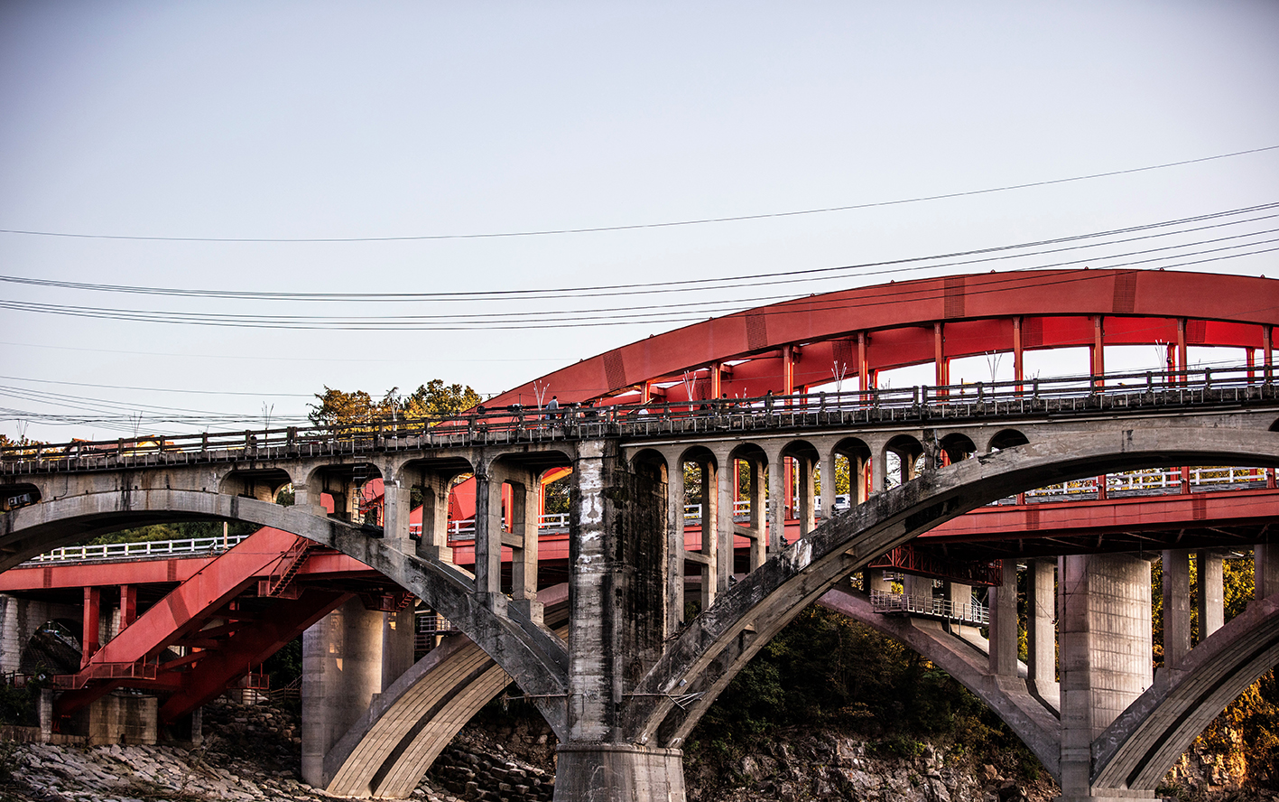 Genau in der Mitte der Seung-il-gyo-Brücke, die eine starke Symbolkraft hat: Sie wurde zur Hälfte von Nord- und zur Hälfte von Südkorea errichtet.